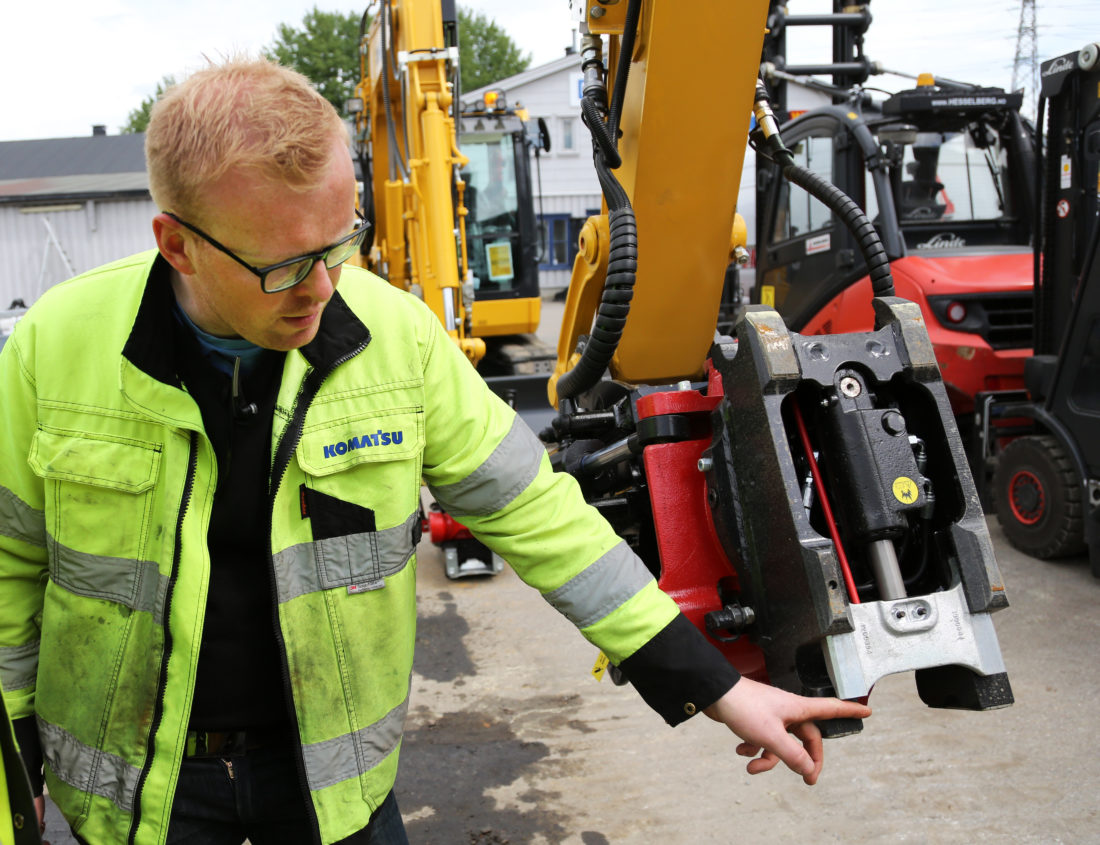 – Aller først bør man for sikkerhets skyld alltid trykksette låsesystemet en ekstra gang. Deretter skal man snu tiltrotatoren 180 grader rundt og se fra hytta at kilene er festet ordentlig. Til slutt legger man trykk på skuffen mot bakken for å se at den faktisk sitter fast. Dette tar bare 15-20 sekunder og det skal man ta seg tid til.