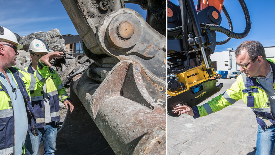 Tiltrotatorene fra Engcon, med Q-safe redskapsfeste. Det har innebygde magnetsensorer som sammen med styresystemet forhindrer at maskinen kan brukes før skuffa er riktig låst.