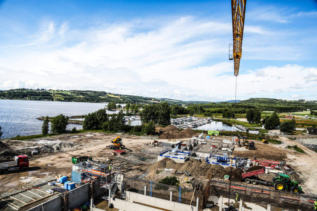 – Vi har gravd ut totalt rundt 10 000 kubikkmeter masser for fundamentering av bygningene, og vi fyller ut med enda mye mer masser, i og med at hele tomta skal heves ca. én meter. Dette fordi den ligger helt inntil Mjøsa, og det må tas hensyn til flomfaren i området, forklarer Arnkværn.