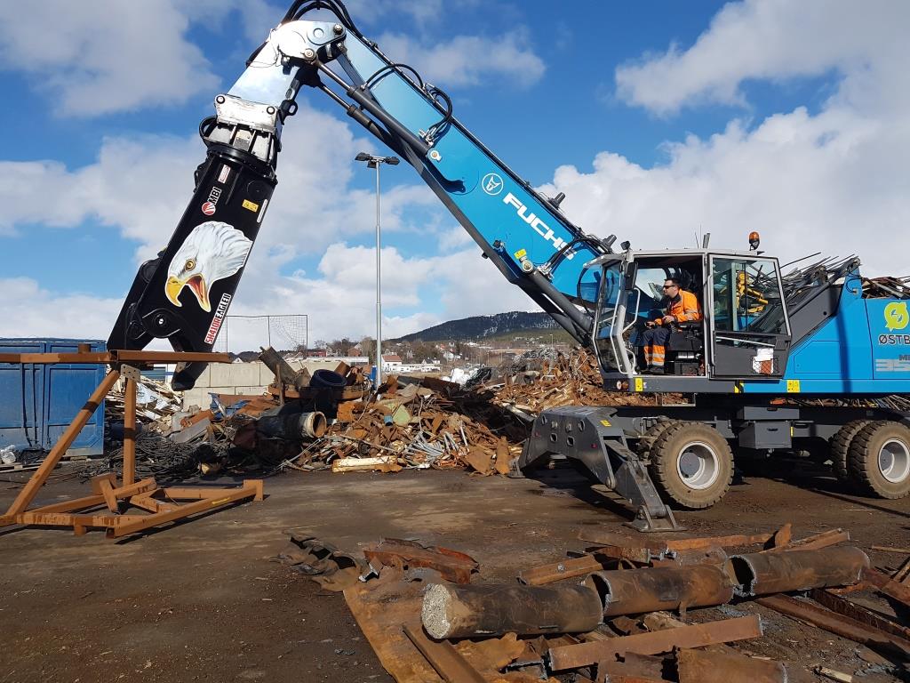 Stålsaksa, av typen SH410R, er fire meter lang, har Oilquick OQ80I hurtigkobling og går til daglig på en Fuchs ML 350 materialhåndteringsmaskin hos Østbø AS i Fauske, et behandlingsanlegg for EE-avfall, bilvrak, jern og metaller.