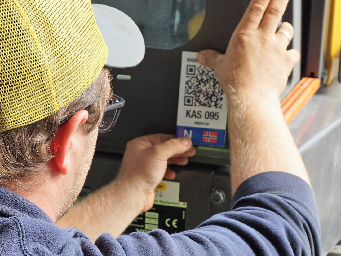 Det første Flateby gjør er å hente opp maskinen i Maskinregisteret via nettbrettet han har med seg og så klistre på QR-koden som blir maskinens «registreringsnummer».