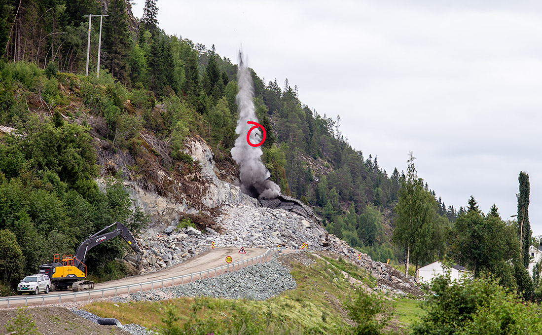 DELPROSJEKT: Her går en av mange salver på FV720 Malmveien. Hva vi ser flyvende i utkanten av støvsøyla (rød ring, under)? Har ingen anelse. (Foto: Jørn Søderholm)