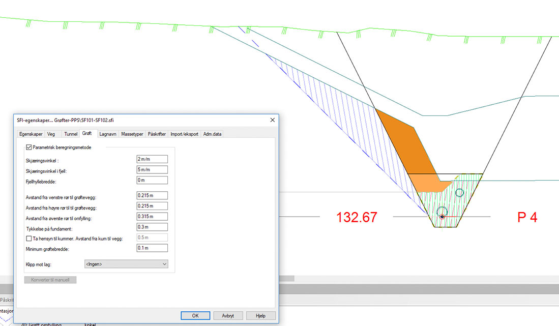 Grøftemodulen kan blant annet automatisere prosjektering av hver side i grøfta. (Skjermdump: Leverandøren)