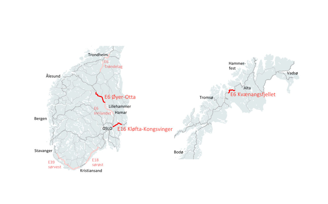 Samferdselsdepartementet tilfører Nye Veier tre nye strekninger: E6 Øyer-Otta i Oppland, E16 Kløfta-Kongsvinger i Akershus og Hedmark og E6 Kvænangsfjellet i Troms.