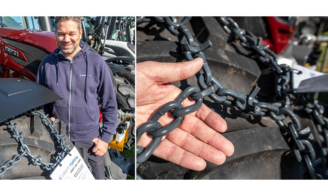 – Den er til store Fendt, Valtra og andre traktorer. Passer til hjuldimensjoner fra 13,6 og oppover. Den er lettere å legge på enn vanlig kjetting. Lettere bygget, men ikke så spinkel som lettkjetting. Dette er til større traktorer, røff bruk, tungt utstyr og krevende forhold. Med U-brodd for maksimalt grep.