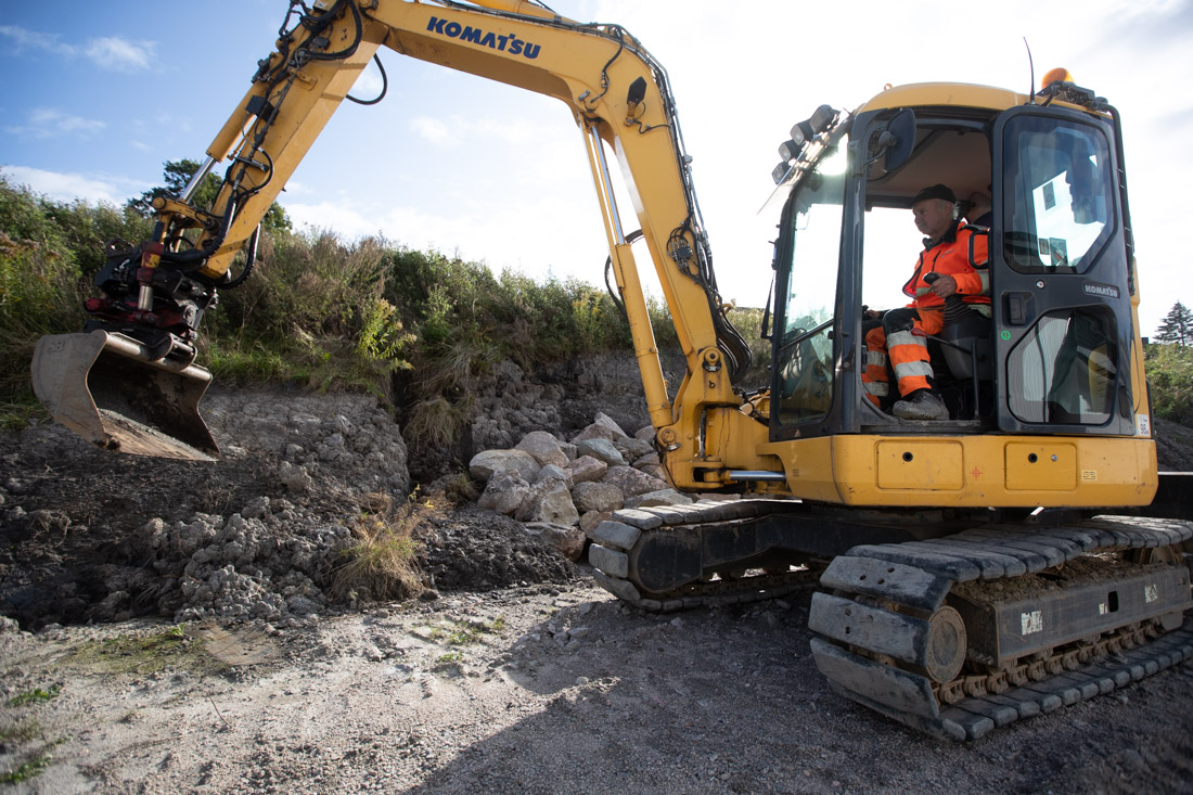 Han jobber på baksiden av et næringsbygg, med rassikring av en skråning med jord, stein og andre løsmasser på baksiden av bygget. Holtet vrir tilten rundt sånn at skuffa står i forgraverstilling, og strekker seg så langt aggregatet går oppunder toppen av skråningen for å lirke unna en stein der oppe.