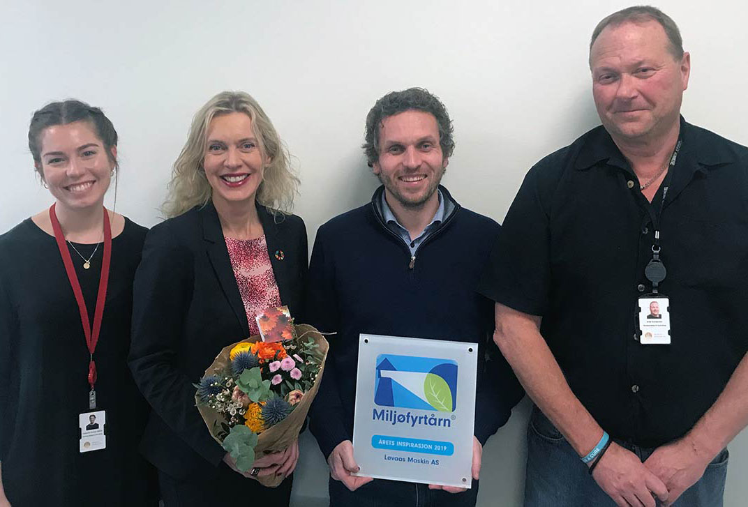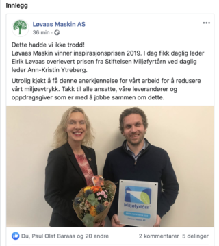 Det sier Løvaas Maskin i en Facebook-oppdatering. Her er det også et bilde av daglig leder Eirik Løvaas som får overlevert Inspirasjonsprisen 2019 fra Stiftelsen Miljøfyrtårn ved daglig leder Ann-Kristin Ytreberg.