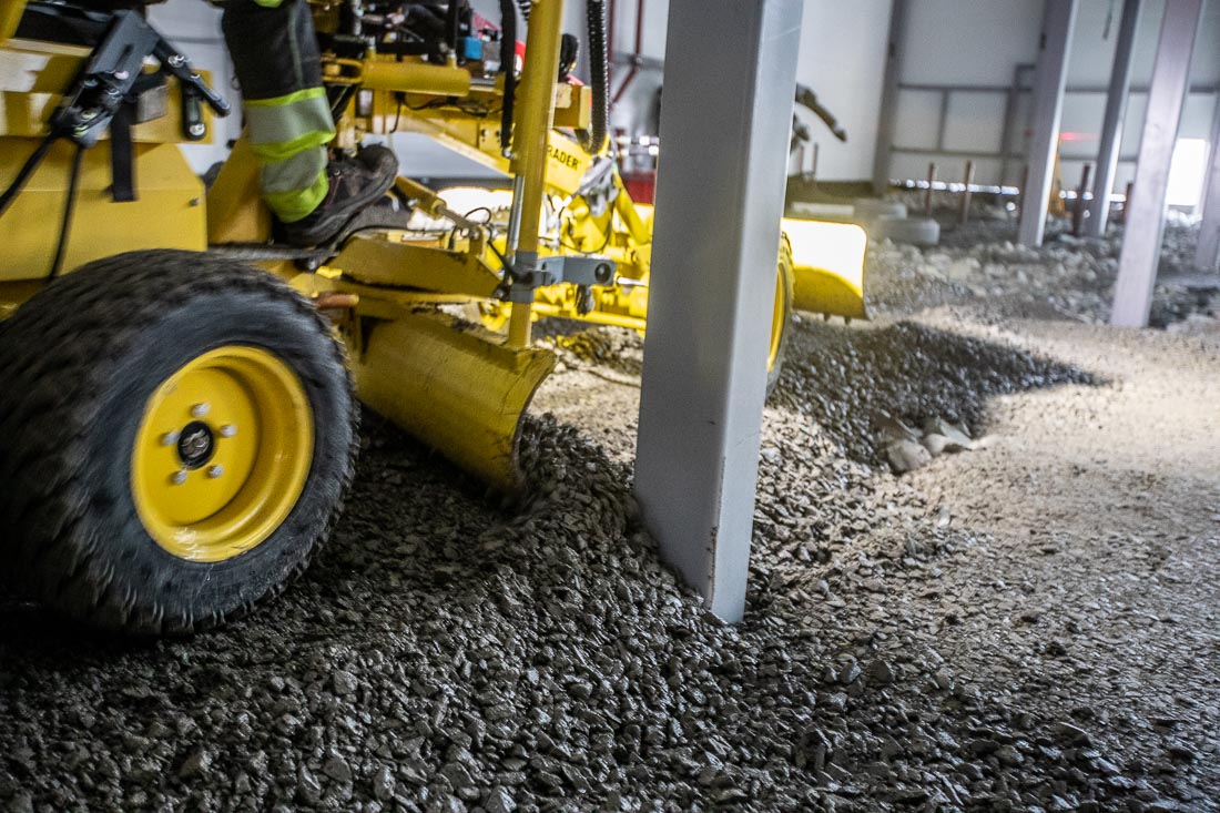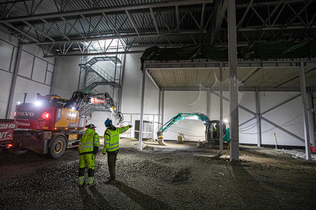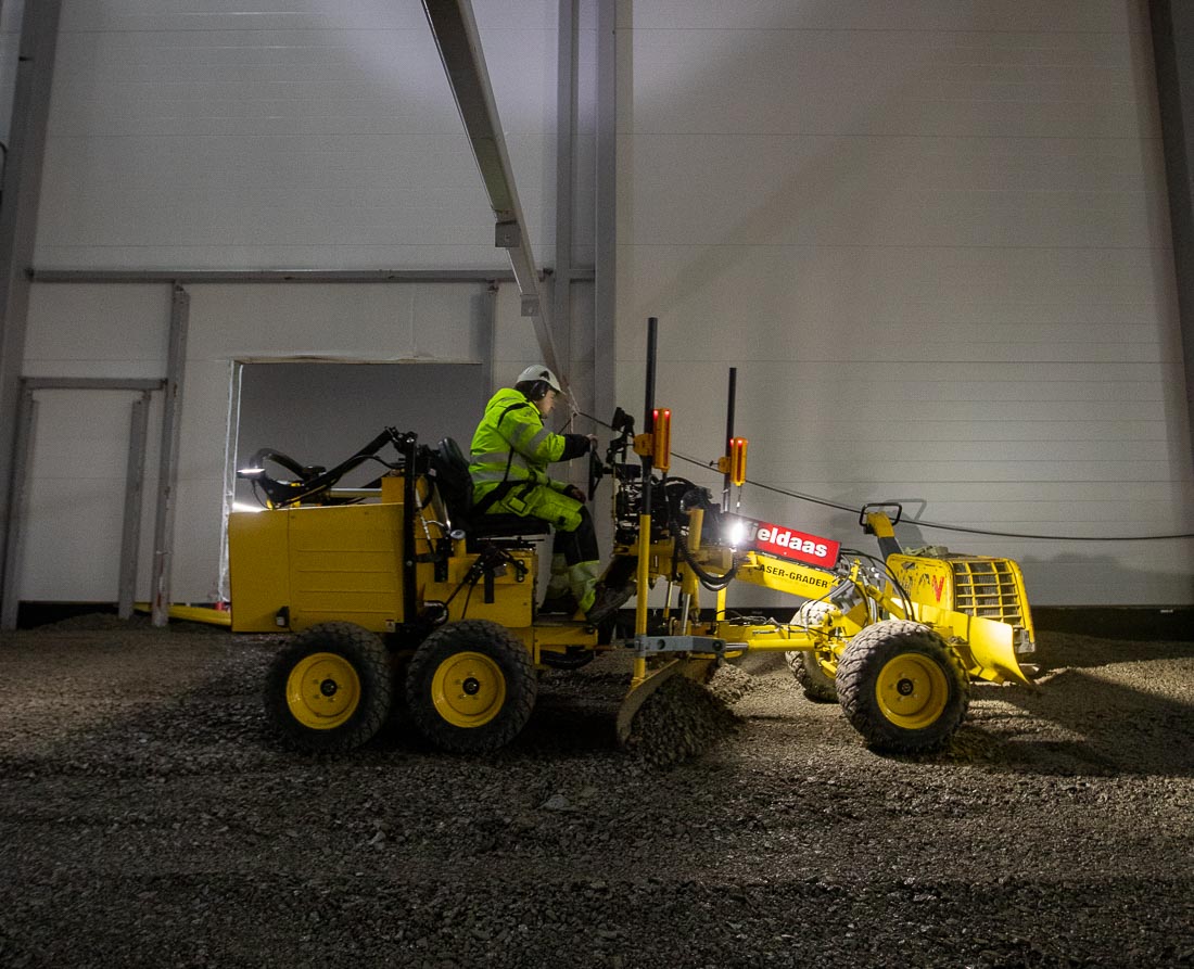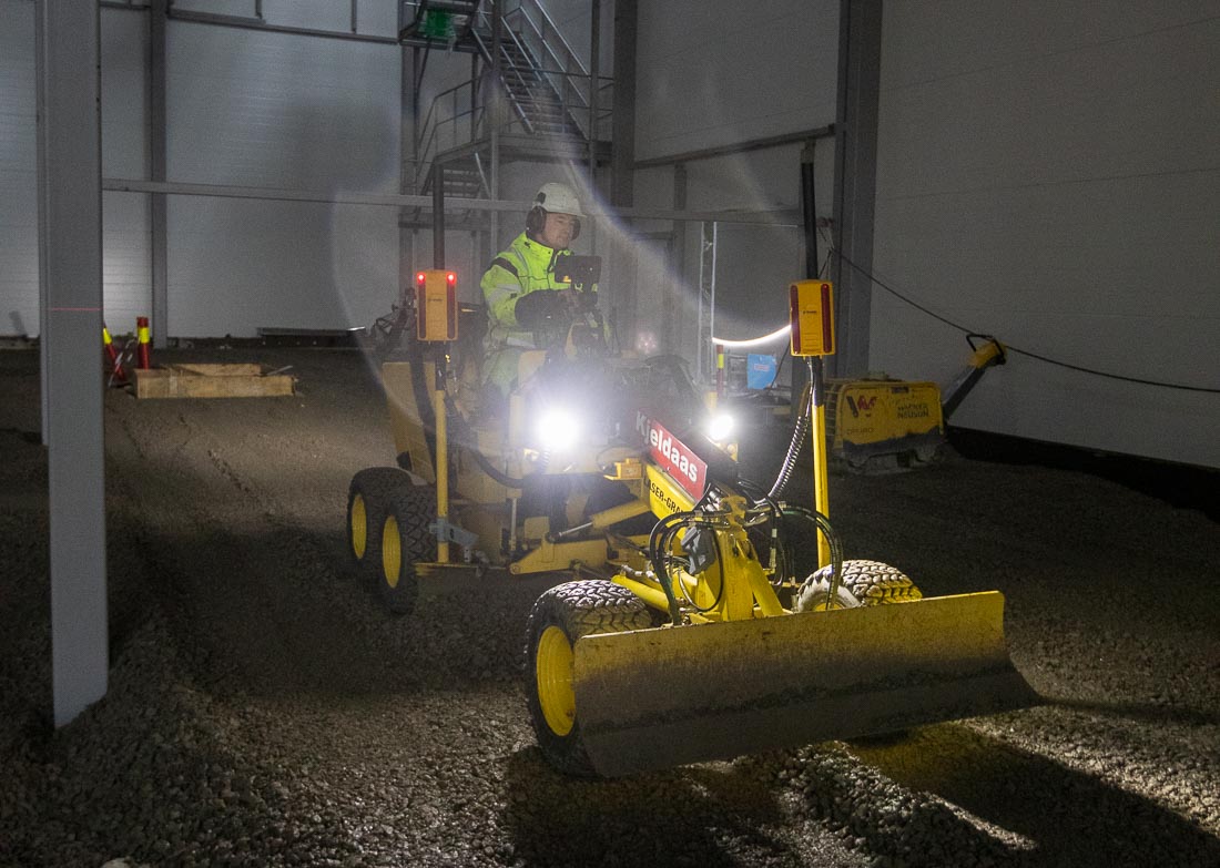 Innendørs planering i et 40 mål stort lagerbygg er ikke arbeid for frihånd og øyemål. Kjeldaas AS har stor nytte av små maskiner med avansert utstyr: En Lasergrader høvel og en Kobelco åttetonner med laser, GPS og 3D maskinstyring.