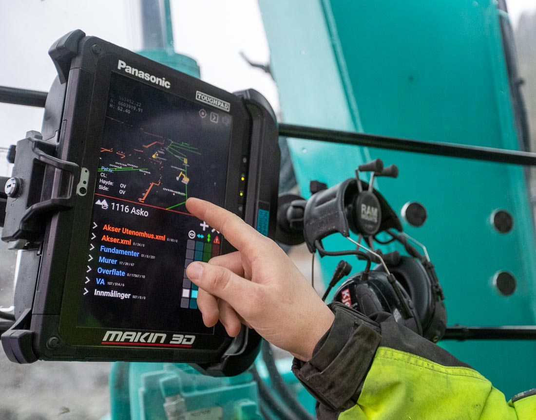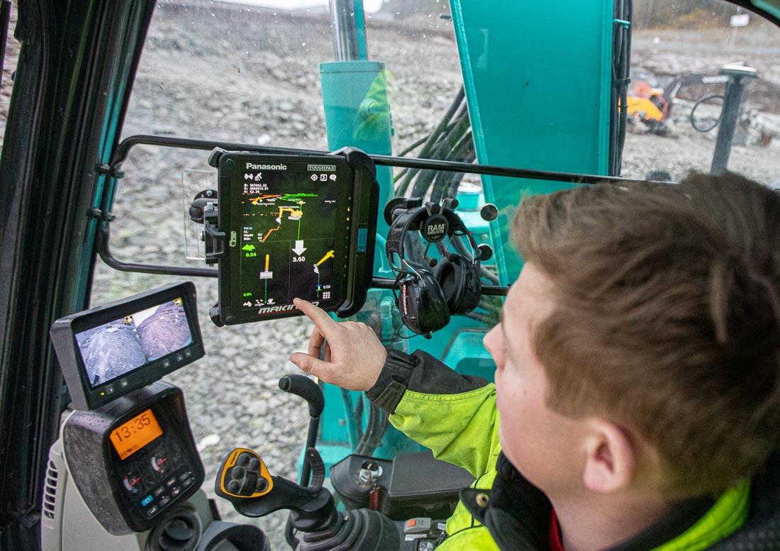 SANDE: – Den er kjempenyttig! Vi bruker den inni bygget nå, for å rette av. Det er veldig fornuftig. Den kommer til plasser som andre maskiner ikke kommer til. Med maskinstyring har vi alt på maskinen. Vi slipper å gå med stikker for å måle inn. Her ligger alt i maskinen.