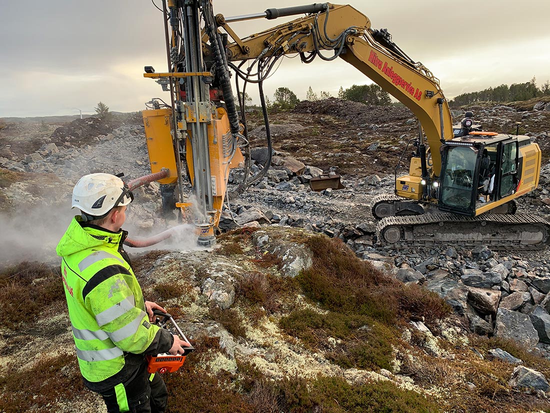 Hitra Anleggsservice har en Cat 320F og en større Volvo EC300EL med hvert sitt AMV boretårn. Begge er fullt integrert med Topcon 3D maskinstyring. Et bredt spekter av boreoppgaver i alt fra skiferbrudd til hustomter og veibygging går kjapt og effektivt med de to.