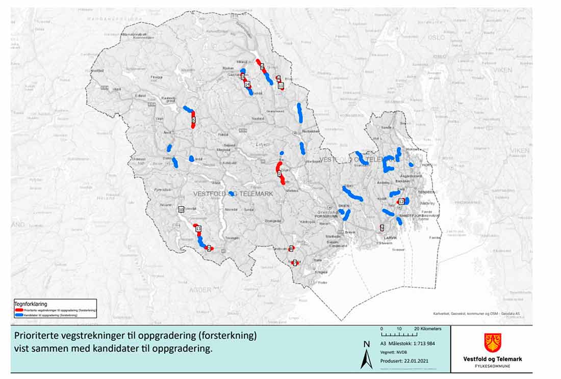 Tiltakene på de 14 strekningene som nå skal oppgraderes inkluderer blant annet stabilisering av veggrunnen, forsterkningsarbeider og ny asfalt i ni av fylkets kommuner. I tillegg er det utarbeidet en reserveliste over veier som bør utbedres, men som fylkeskommunen ikke har økonomi til å prioritere i denne omgang.
