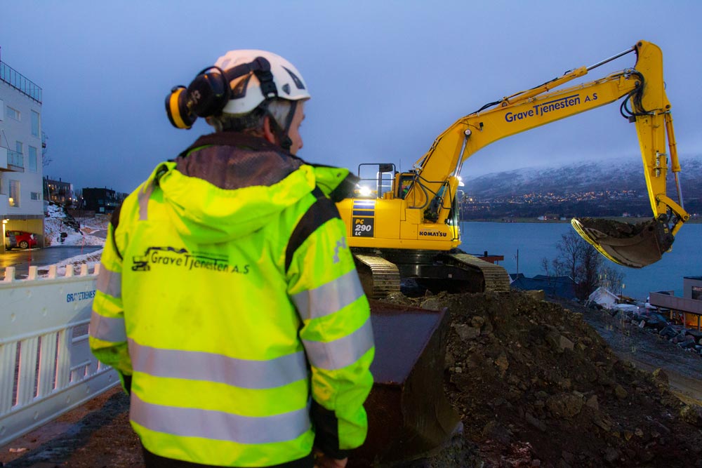 På Solneset i Tromsø jobber GraveTjenesten for fullt med å ferdigstille grunnarbeidet for et stort boligfelt som skal inneholde både hus og leiligheter. Oppdraget inneholder en stor fyllingsjobb i tillegg til at masser skal fjernes, berg skal sprenges og bakken planeres.