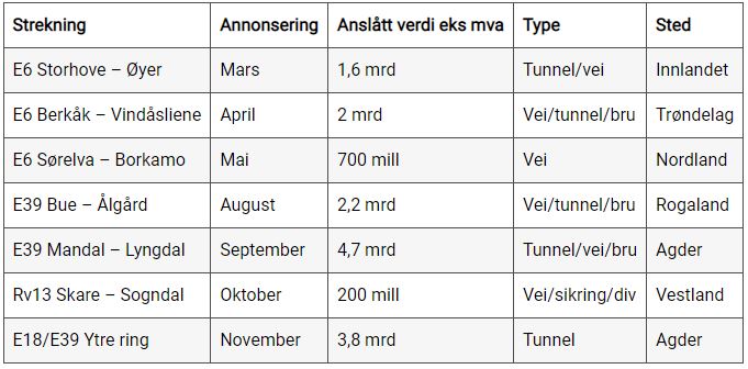 Konkurransene vil kunne gi store muligheter for anleggsbransjen over hele landet. Stor variasjon fra 200 millioner kroner til cirka fem milliarder i størrelse vil, ifølge Nye Veier, gi muligheter for mange. Den samlede verdien av konkurransene er anslått til 15 milliarder kroner, ifølge en pressemelding.
