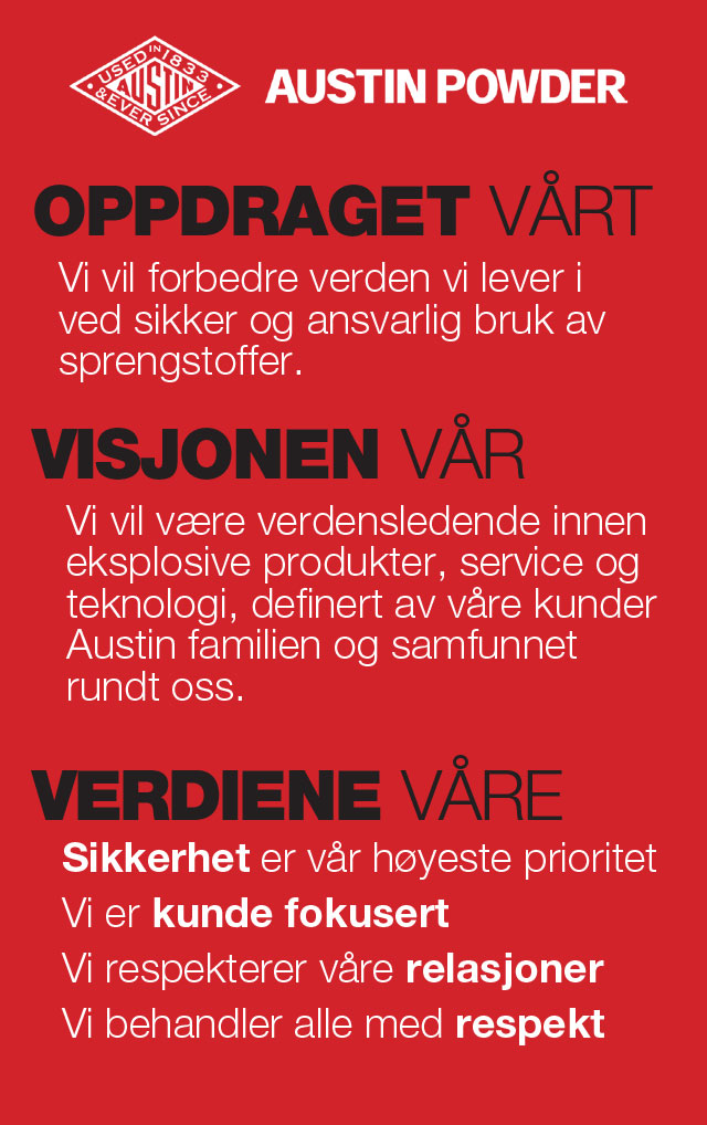 Austin Powder har et oppdrag: Vi vil forbedre verden vi lever i ved sikker og  ansvarlig bruk av sprengstoffer.