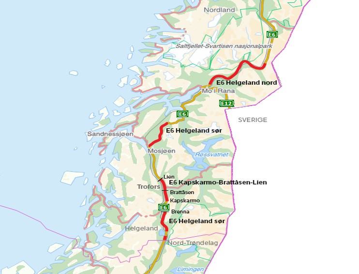Når de siste to strekningene står ferdig har Statens vegvesen siden oppstarten i 2015 bygd og utbedret 142 kilometer ny vei gjennom Helgeland. Av dette vil hele 120 kilometer være 90-sone. E6 fra Nordland grense til nord på Saltfjellet vil da med få unntak ha gjennomgående god eller høy standard. Totalt vil det bli brukt 9 milliarder kroner på E6 Helgeland, fra Saltfjellet til Trøndelag grense, ifølge veivesenet.
