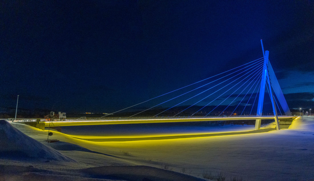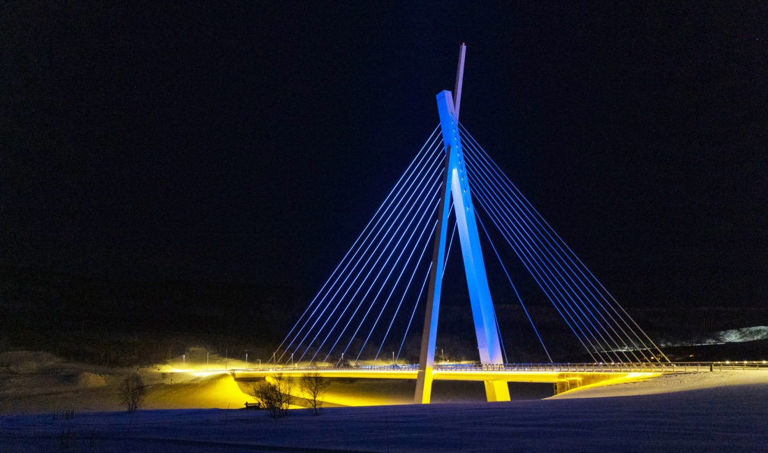 I kveld ble Tana bru i Finnmark lyssatt i de ukrainske farger for å markere solidaritet med Ukraina og motstand mot krigen.