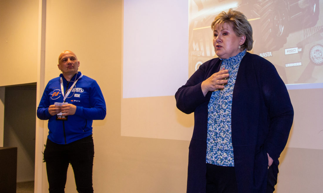 Da han inviterte Høyreleder Erna Solberg opp på scenen, ble hun møtt med så stor applaus at man nesten skulle tro hun fremdeles var statsminister. Solberg roste de unge som har valgt yrkesfaglig studieretning, og hun mente bestemt at anleggsbransjen går en lys fremtid i møte.
