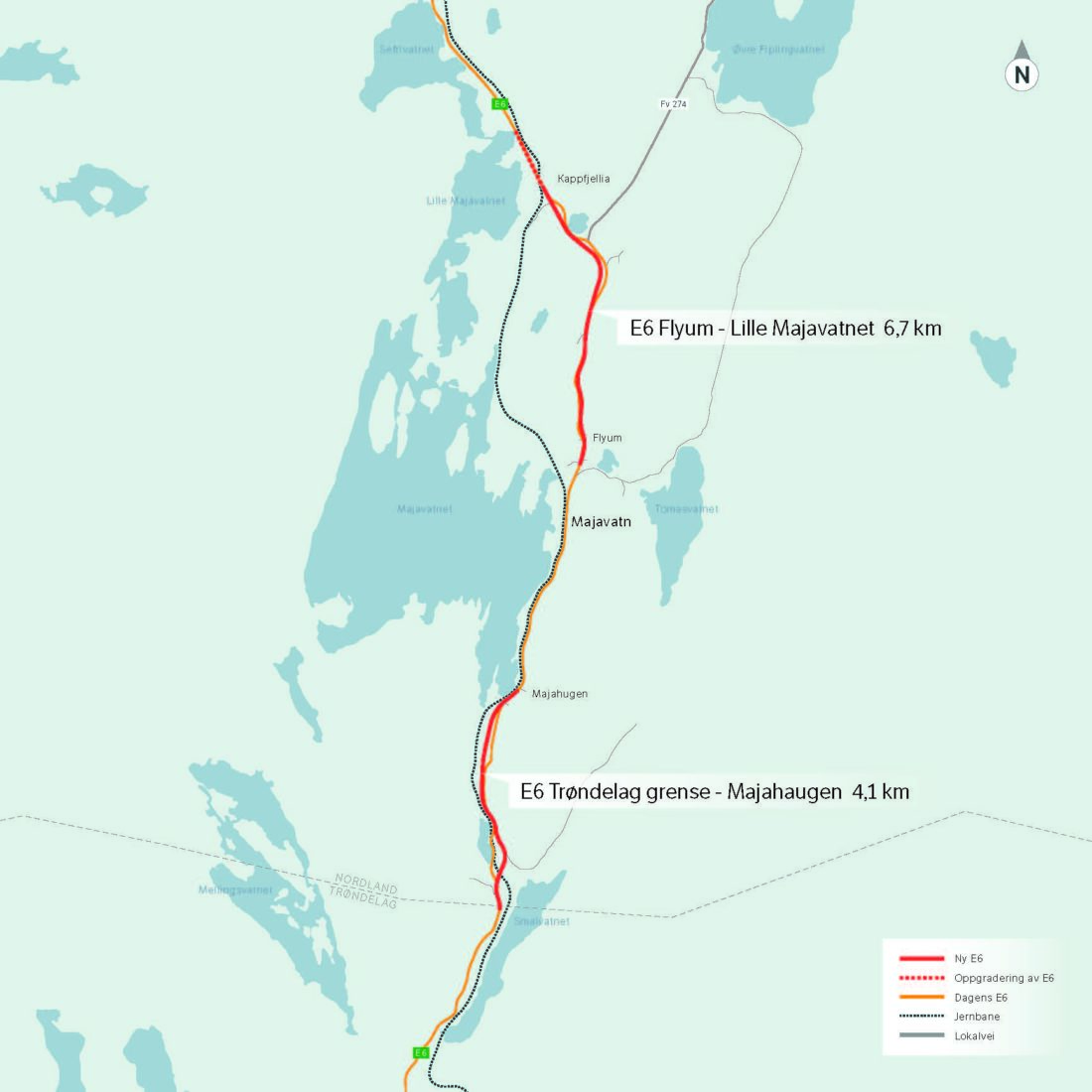 Arbeidene omfatter prosjektering og bygging av om lag 9,6 kilometer ny E6, med fartsgrense 90 km/t på strekningen Trøndelag grense-Majahaugen og Flyum-Kappfjellia. Ny veilinje går stort sett i lett terreng utenfor eksisterende E6.