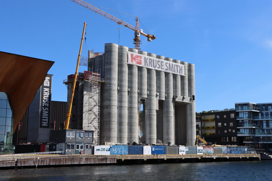 På bryggekanten i Kristiansand utøver Kruse Smith ekstremsport innenfor byggrehabilitering – en kornsilo fra 1935 skal bli kunstsilo.