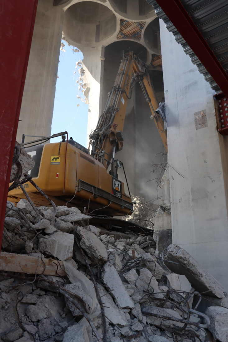 – Vi kutter silorørene i 20 meters høyde, og måtte derfor lage en bjelkestruktur mellom sylindrene først. Det var en ganske komplisert prosess. Vi måtte innimellom alle rørene og lage hull, og støpe opp armerte betongbjelker. Da dette var ferdig begynte arbeidet med å rive inne i siloen, sier Hartveit.