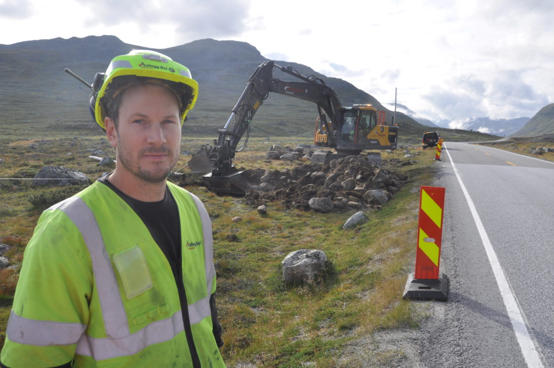 Han inspiserer arbeidet med fire kilometer fresegate som akkurat er startet på høyfjellet fra Vestland grense og østover mot Bjøberg,