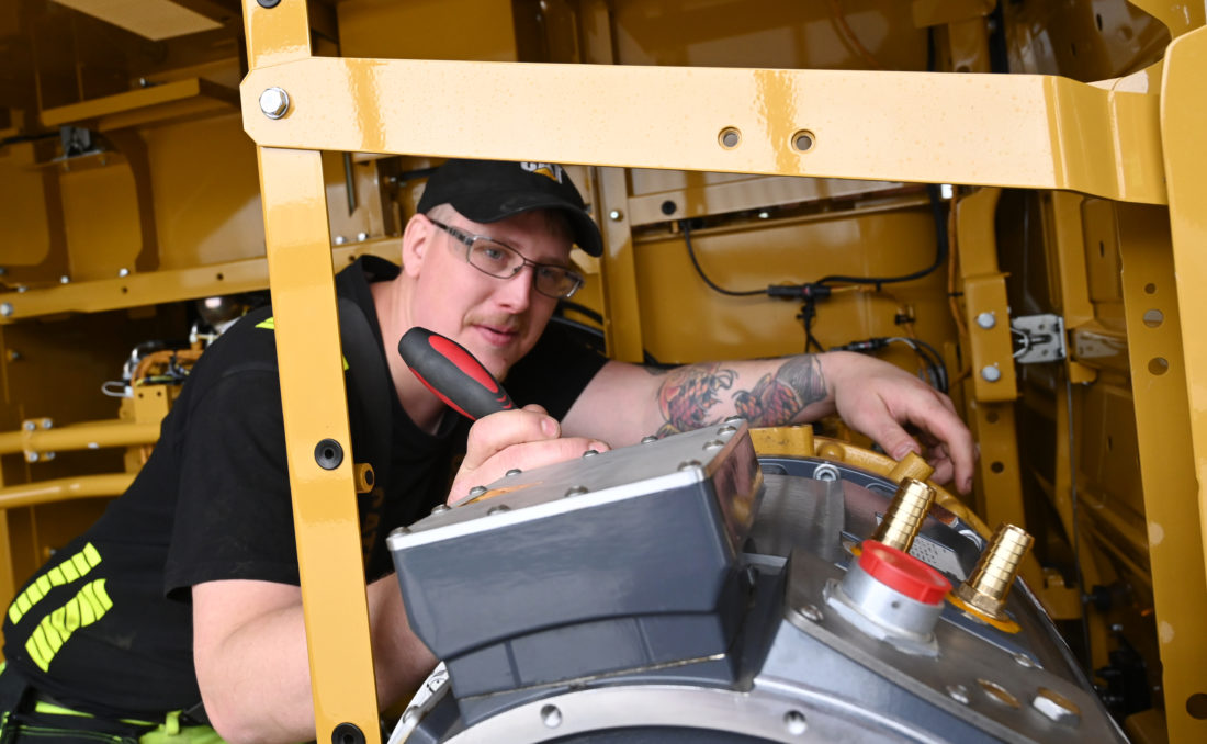 – Det er leveringsutfordringer på utslippsfrie maskiner. Derfor startet vi med å bygge om fra diesel- til eldrift, men nå får vi fabrikkproduserte som vi monterer her på Sandnes. Vi er ferdige med den ene, og jobber nå med å ferdigstille den andre, forteller mekaniker Stian Vestre. Han er selvlært til å gjøre jobben.