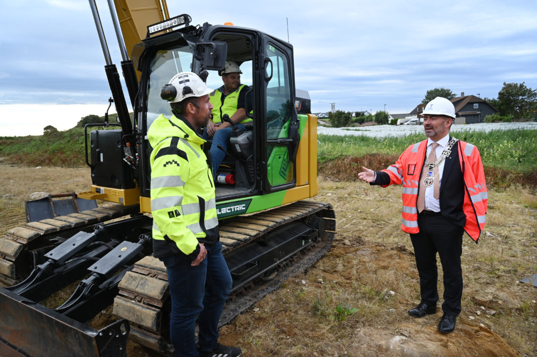 Daglig leder i Bjelland AS, Joakim Hetland, forklarer Sola-ordfører Tom Henning Slethei hvordan den elektriske gravemaskinen fungerer da ordføreren tok første spadestikk. (Foto: Øyvind Ellingsen)