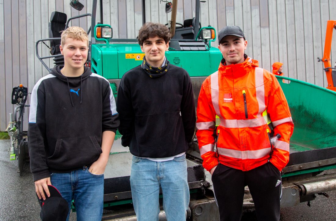 Elias Aarflot (t.v.), som går Vg1 Bygg- og anleggsteknikk, og Roder Iversen som går Vg1 TIF, syntes asfaltutleggeren var tøff. Asfaltør i Veidekke, Rolf Vikene (t.h.), var naturligvis helt enig. (Foto: Runar F. Daler)