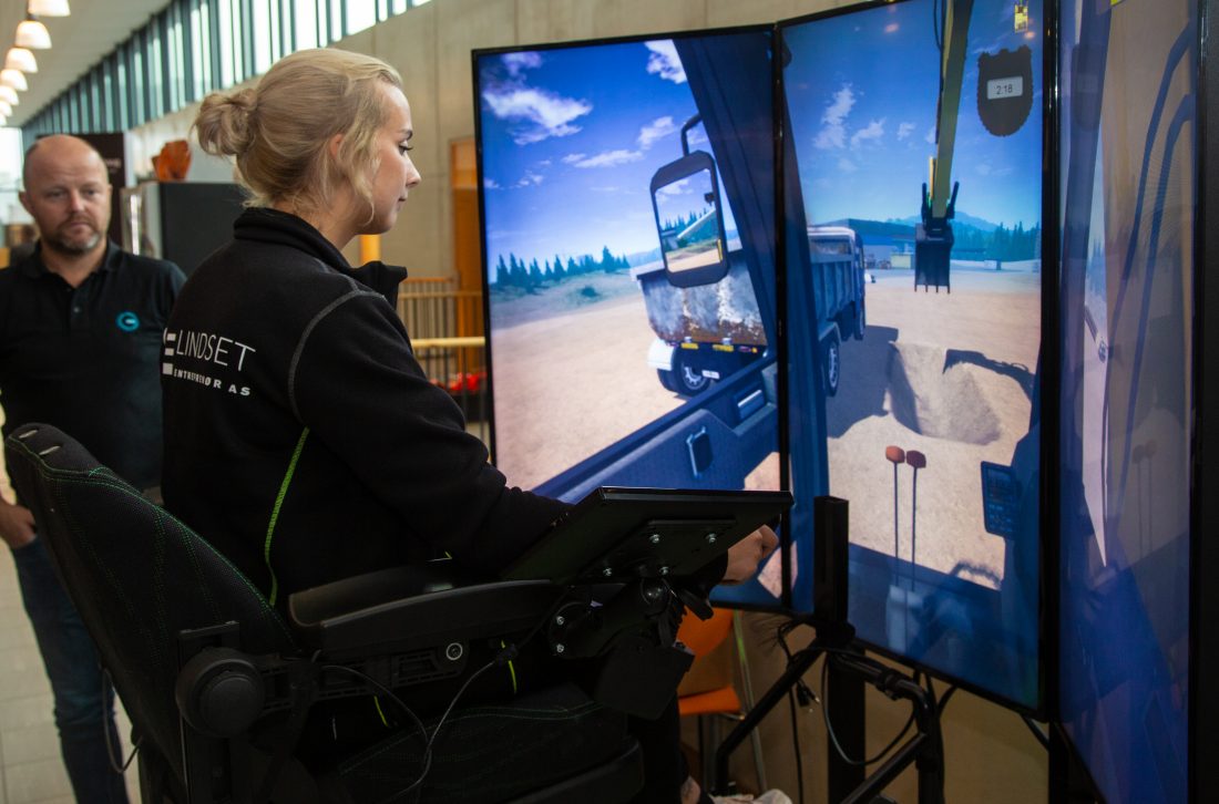 Samantha Haddal, som er lærling i anleggsmaskinførerfaget, hadde bra kontroll i simulatoren. OKABs Are Haukaas følger med i bakgrunnen. (Foto: Runar F. Daler)