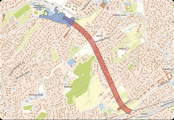 Kartskisse Gjønnestunnelen.  Blått felt viser dagsone, mens rødt viser tunnel. (Ill: Statens vegvesen)