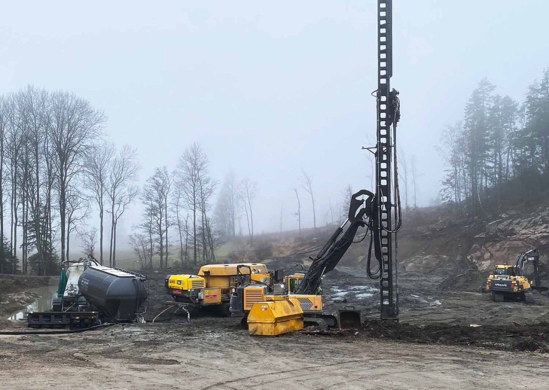 Dette blir stabilisert gjennom kalksementpæling av et større område mot syd. Det er her maskinen med det høye tårnet kommer inn i bildet. Gjennom februar og mars har maskinen vært i sving med å sette ned disse kalkpælene.