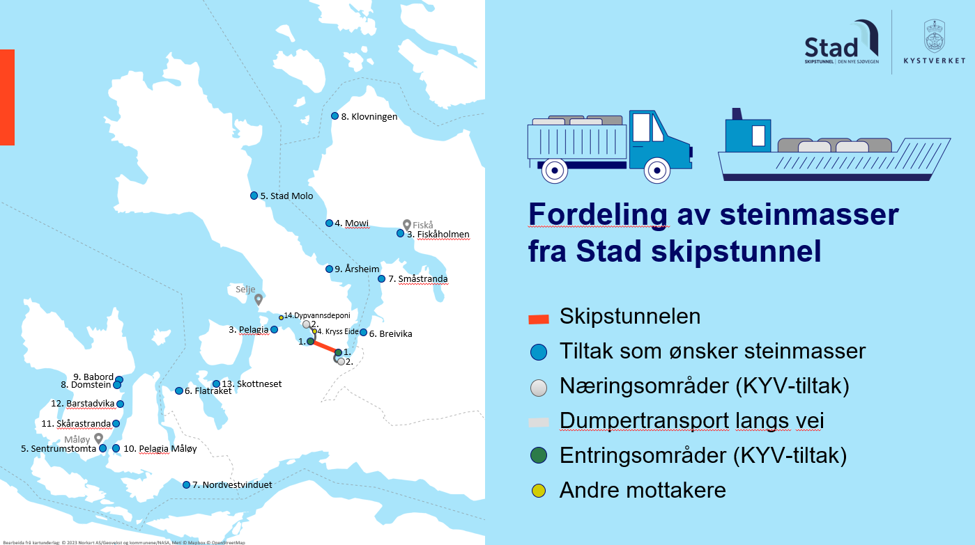 Kystverket og kommunene Stad, Kinn og Vanylven er nå enige om en prioriteringsliste over hvilke næringstiltak som kan motta steinmasser fra Stad skipstunnel. Se lista her!