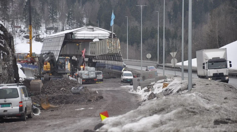 Drammensvogna på Isielva bro og E16 Bjørum-Skaret vinteren 24 på vei mot siste støp til våren. (Foto: Kjell Wold)