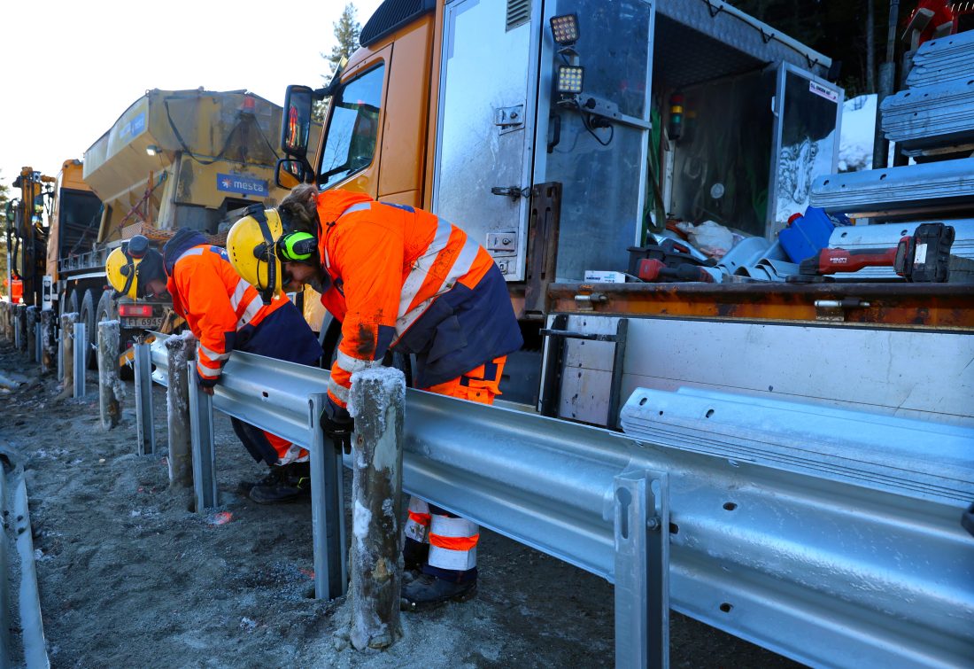 Arbeidslaget på fire har god kontroll på arbeidsoppgavene. Internt i Mesta kaller de seg «rå på rekkverk», og jobber seg framover med en god del meter per dag. Varselskilt, lys og sikring rammer inn arbeidslaget. Men lufttrykket fra bilene og vogntogene som kjører forbi merkes likevel godt.