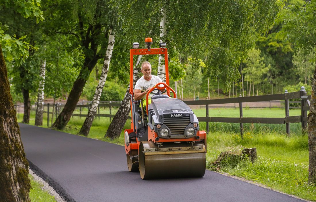 Asfaltgründeren er selv med på hele asfalteringsprosessen; han blander, kjører og legger ut asfalten.